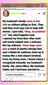My husband’s family came to live with us without telling us first. They said they won’t pay rent or help with chores. I just said, “”Okay, no problem! Lol.”” See what happens next.